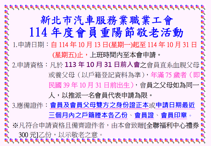 本會114年度會員重陽節敬老活動將自114年10月13日起至114年10月31日止上班時間受理申請,符合申請資格且備齊證件之會員,由本會致贈[全聯福利中心禮券300元]乙份,以示敬老之意!