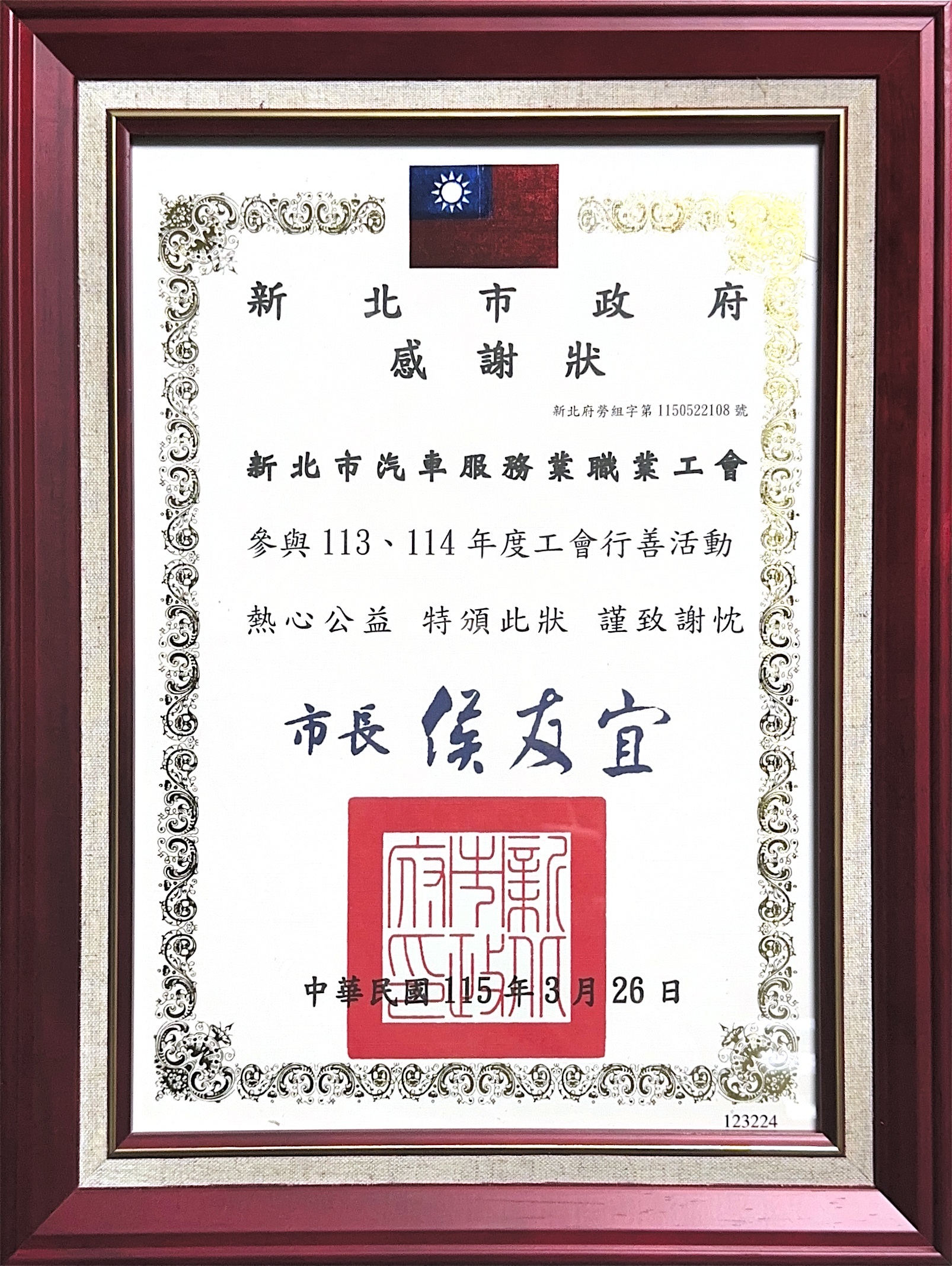 本會獲頒新北市113、114年度工會行善團感謝狀